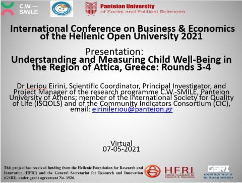 Με απόλυτη επιτυχία ολοκληρώθηκε η συμμετοχή της Επιστημονικά Υπεύθυνης στο "International Conference on Business & Economics of the Hellenic Open University 2021" και με τίτλο εισήγησης: "Understanding and Measuring Child Well-Being in the Region of Attica, Greece: Rounds 3-4",την Παρασκευή 07/05/2021.